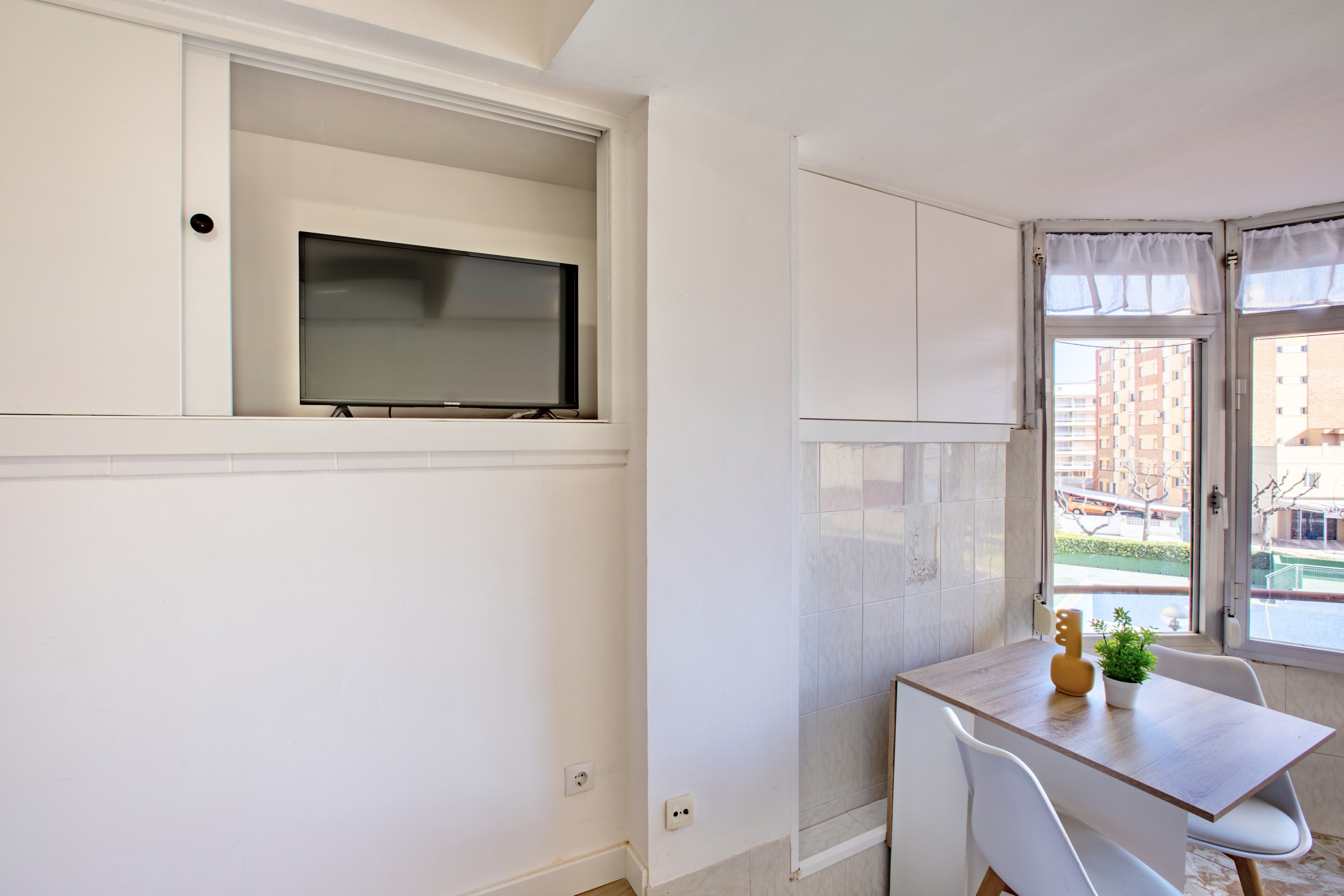 Estudi en La Pineda posseeix capacitat per a 2 persones. Allotjament de 23 m². Disposa de ascensor, rentadora, planxa, accés internet (wifi), aire condicionat, piscina comunitària, Televisió. La cuina americana, de vitroceràmica, està equipada amb nevera, microones, vaixella/coberteria i cafetera.
